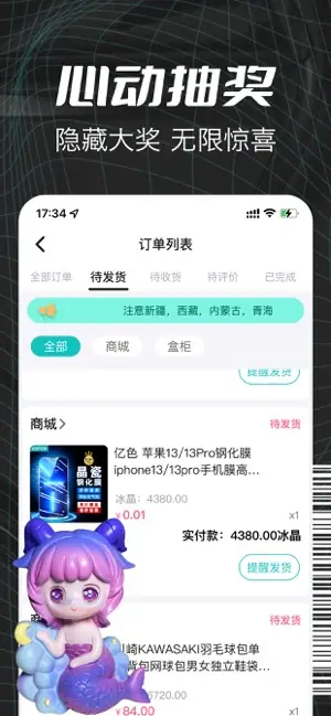 超人气品牌盲盒商城上线,稀有隐藏款盲盒在线开启,绝无空包,100%必中。 神秘开盲盒总能带给你无限的期待与惊喜! 好运不断,惊喜抽不断,app支持回收功能,抽到不喜欢的商品可以卖回给平台换取冰晶,通过冰晶来商城换取你喜欢的宝贝,100%可回收。抽到自己喜欢的商品或者冰晶兑换到商品可以直接领取,一律包邮到家,抽中即可领取,快进来开个盒子,试试你的手气吧!